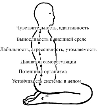 Поэтому силой Вишуддхи определяются чувствительность и возможность адаптивности человека, силой Анахаты – его выносливость по отношению к внешней среде, силой Сурья – его лабильность, агрессивность, утомляемость (в зависимости от внешних факторов), Манипуры – диапазон возможности саморегуляции, Свадхиштханы – потенциал организма, Муладхара определяет устойчивость системы в целом (рис. 10).