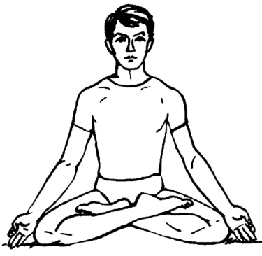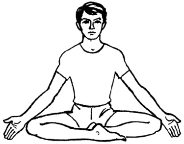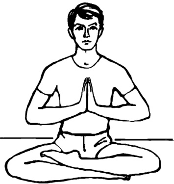 Перед началом выполнения комплекса необходимо настроить себя на занятие: успокоить ум, дыхание, сосредоточиться на ощущении тела. Для такой настройки традиционно принято использовать определенные позы (асаны), способствующие глубокому сосредоточению. В зависимости от предпочтения и физических возможностей занимающегося это могут быть «поза ученика» сидя на пятках – ваджрасана (рис. 11) и поза со скрещенными ногами – сукхасана (рис. 12). Возможно использование и более сложных вариантов позы лотоса – ардха падмасаны и падмасаны (рис. 13, 14), в которых одна или обе ступни кладутся на бедро противоположной ноги. При невозможности выполнения ни одной из этих асан можно просто сесть на стул, выпрямить спину и посидеть примерно одну-две минуты с закрытыми глазами. Руки можно положить на бедра или соединить перед грудью в позе намасте – жесте молитвы и медитации (рис. 13).