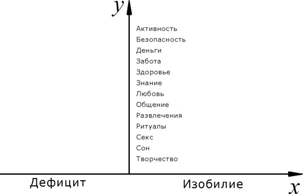 Из этого же следует, что понятие дефицит и изобилие взаимосвязаны и находятся на одной оси координат. Т.е. слева от нуля по оси Х находится состояние или ощущение дефицита, а справа – изобилия.