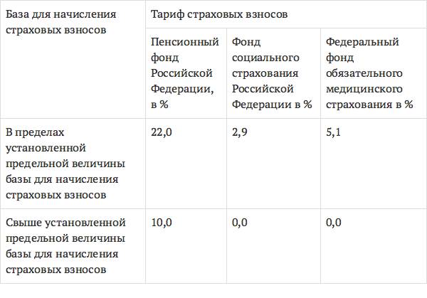 В чем новизна тарифов на 2012–2013 годы? Общий объем основного тарифа снижен с 34 до 30 % за счет уменьшения тарифа в ПФР на 4 процентных пункта. Ранее действующий пенсионный тариф в ФСС сохранен, платежи на медицинское страхование уплачиваются лишь в Федеральный фонд (в прошлом они вносились как в Федеральный фонд, так и территориальные фонды). Кроме того, установлены дополнительные страховые платежи в ПФР с заработка, превышающего предельную величину базы для начисления страховых взносов.