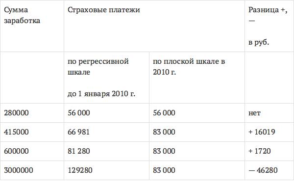 Сравним для примера суммы страховых взносов, уплачиваемых по старой (регрессивной) шкале и по новой (плоской) шкале при заработке до 280 тыс., 415 тыс., 600 тыс. и в 3 млн руб.
