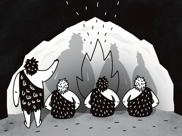 Ну а так как мир идей куда важнее мира вещей, то Платон говорил, что наш мир – это всего лишь слабое отражение того мира. После философа остались его знаменитые диалоги, то есть разговоры с другими людьми, которые эти люди записали, – не на диктофон, конечно, а на том самом пергаменте или специальных восковых табличках. И в одном таком диалоге, который называется «Государство», он рассказал об этом отражении мира с помощью удивительной истории про пещеру. Смотри: в пещере с самого своего рождения живут несчастные узники. Они всё время сидят спиной ко входу и видят только тени на стене. Бр-р-р, даже мне сейчас стало страшно и тоскливо. Но не будем отвлекаться. Тени – это всё, что они знают о мире. И так как больше узники ничего не знают, то они думают, что это и есть настоящие вещи. Пока они сидят, им заняться больше нечем, и они наблюдают, как тени движутся. Бедные жители пещеры даже придумывают, как тени связаны друг с другом. Скажем, за тенью человека следует тень лошади – значит, они вместе. Узники при этом верят, что знают, как устроен мир, но на самом-то деле они видят только тени.