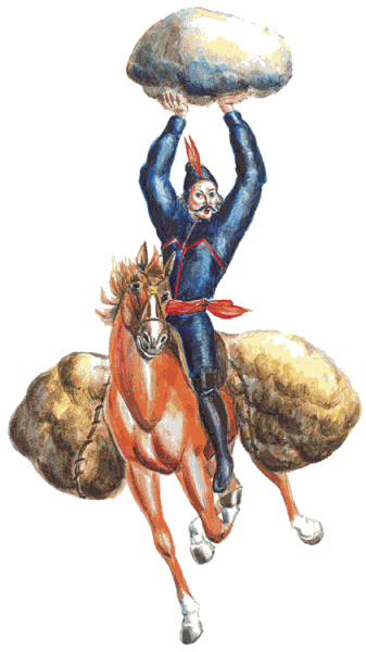 Однако продолжалось это недолго. Пришел день, когда Абрскил решил помериться силами с верховным богом Анцва. Богатырь наполнил кожаные мешки доверху огромными валунами, привязал этот груз к седлу, вскочил верхом на своего крылатого коня-араше и поднялся в небо. Взмахнув саблей, Абрскил рассек тучу, вызвав молнию, а затем сбросил на землю несколько валунов и произвел ужасный шум, подобный грому.