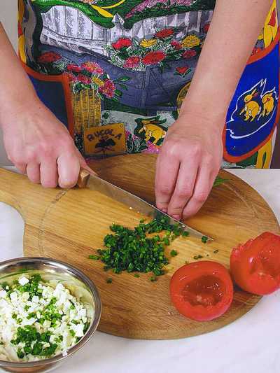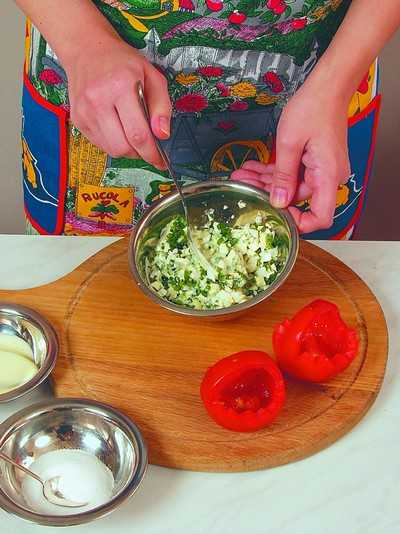 Подготовить помидоры к фаршировке. Для этого их нужно тщательно вымыть, проследить, чтобы на помидорах не было повреждений, затем срезать верхушку и аккуратно удалить сердцевину. Из помидоров можно изготовить корзиночки. Для этого нужно сначала вырезать из помидора одну четвертинку, затем аккуратно удалить сердцевину, после чего вырезать другую четвертинку так, чтобы получилась ручка корзинки, а края корзинки можно сделать зубчатыми. Сваренные вкрутую яйца очистить, затем нарезать или измельчить на терке. Сыр натереть на мелкой терке. Зеленый лук и зелень петрушки нашинковать и добавить к измельченным яйцам и сыру. Половинку зубчика чеснока измельчить при помощи чеснокодавилки. Полученную смесь заправить майонезом, добавить измельченную половинку зубчика чеснока, соль, после чего все тщательно перемешать. В изготовленные из помидоров корзиночки выложить готовый салат. Затем помидоры подать к столу, украсив листьями салата, петрушкой и зеленым луком.
