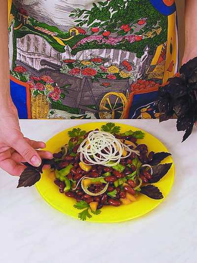 1/2 желтого и 1/2 зеленого болгарского перца, 150 г красной или желтой консервированной фасоли, 2 ст. ложки растительного масла, 1 луковица, 1/2 пучка кинзы, зелень базилика, соль, перец черный молотый.