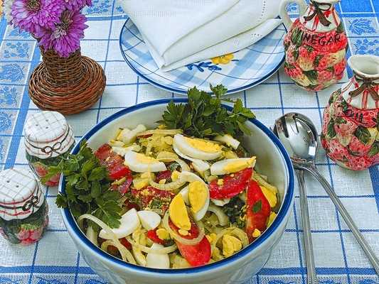 1 клубень картофеля, 2 помидора среднего размера, 2 яйца, 1 луковица, 2 ст. ложки растительного масла, 1 ч. ложка винного уксуса, зелень сельдерея, соль.