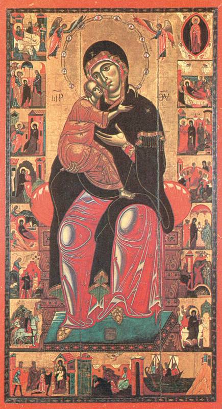 Икона пизанского мастера «Мадонна с младенцем на троне» (около 1280, ГМИИ, Москва) относится к другому канону – Мадонны-путеводительницы. Богородица не прижимает ребенка к себе, а указывает на него рукой.