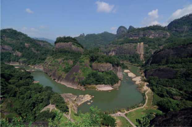 Горы на обоих берегах обладают природной красотой. Когда они не покрыты зеленой шалью и абсолютно обнажены, видно, что красная горная порода в процессе многолетнего окисления покрылась слоем черного оксида железа. Вода оставила здесь много белых следов. В прошлом увлажненная поверхность вздымалась, и на ней появились «морщины», которые смотрелись естественно и очаровательно. Сидя или стоя, можно представить тихо лежащего могучего льва, взлетающего сокола, невинного озорника или простодушного старика-крестьянина. Здесь нет ни капли мирского влияния. Большая часть гор покрыта густым лесом и высоким бамбуком. Вьющиеся плющи покрывают камни, вновь и вновь показывая красоту этих мест.
