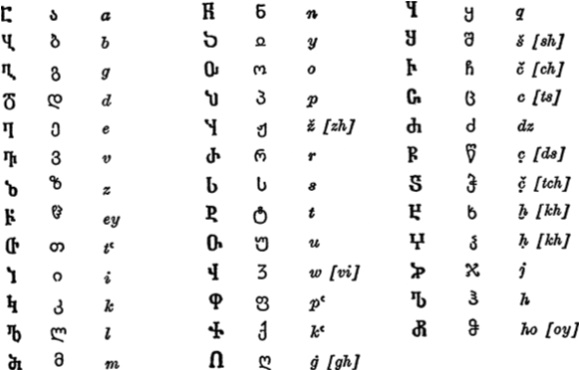 Рис. 3. Основные формы грузинского алфавита: первая колонка – хуцури (маюскульное церковное письмо), вторая колонка – мхедрури, или современный алфавит, третья колонка – фонетическое значение знаков