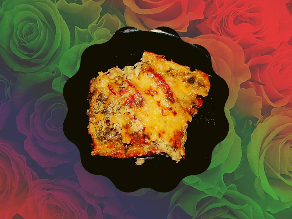 Противень застелить фольгой и смазать маслом. Выложить на него получившуюся массу. Сверху украсить нарезанными кружочками помидорами и мелко нашинкованной зеленью. Затем посыпать натертым на крупной терке сыром.