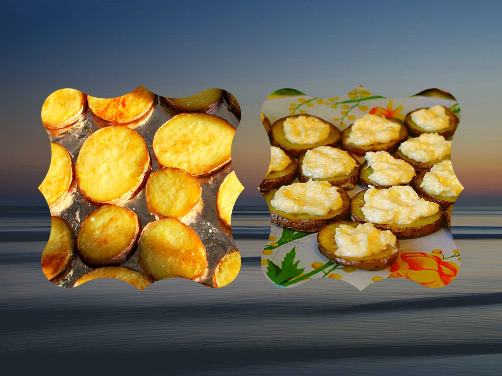 Картофель тщательно промыть. Не очищая, нарезать на кружки толщиной либо 5 мм, либо 1 см. Противень застелить фольгой и промазать подсолнечным маслом. Выложить наши кружочки, присыпать их ССС. Поставить противень в разогретую до 220℃ духовку на 10-15 минут. Пока кружочки пекутся, вам следует натереть сыр на крупной терке, добавить в него измельченный чеснок (на мелкой терке, либо в чеснокодавилке) и майонез, перемешать.