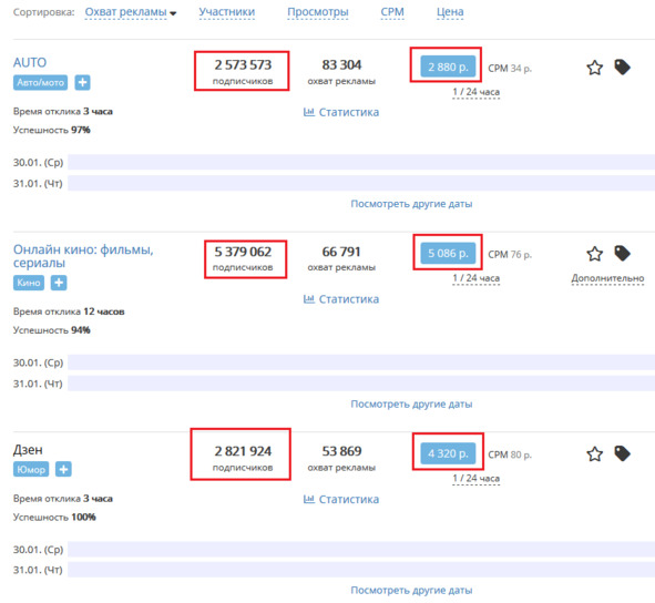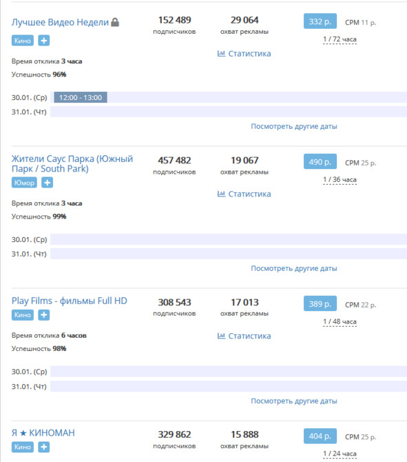Как видите, в миллионниках, в большинстве вариантов цена рекламы, действительно, примерно 100 рублей за 100 тыщ участников. А что же в менее раскрученных группах? Давайте в поиске поставим цену до 500 рублей и посмотрим: