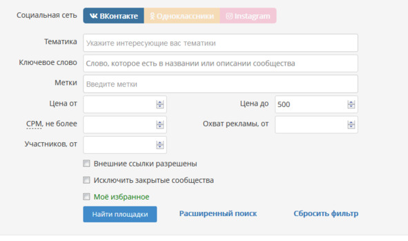 Аналогично, можно посмотреть цены на размещение рекламы в группах в социальной сети «Одноклассники» и Instagram, щёлкнув в настройках поиска по названию одной из этих сетей в пункте «Социальная сеть».