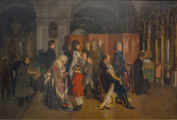 Вот солидный купец в добротной шубе на лисьем меху, он сидит на стуле в ожидании очереди, глубоко погрузившись в свои мирские расчеты, его мысли далеки от обряда, он не задумывается над его смыслом, он привык его исполнять, как и его далекие предки. Чуть позади него стоят, терпеливо дожидаясь очереди, два старика-крестьянина. Для присутствующих привычно, что богатому всегда почет и уважение – таков закон жизни. Молодой чиновник ерзает на стуле, заглядывая за перегородку. Он явно торопится и выполняет обряд на ходу, как обязательный визит к начальству. Тут же старушка, строго наставляющая внука, как себя вести в церкви, что отвечать священнику. Для двух крестьянских мальчиков, стоящих в очереди, это просто утомительная и непонятная повинность. Гордая дама, находясь в непривычной для нее обстановке, среди простонародья, испытывает неловкость и принимает холодный вид… Интересно, что конца очереди на полотне не показано. Возможно, где-то там, за границами холста, и мой дедушка Иван задумался о своей грешной жизни и покаянии.