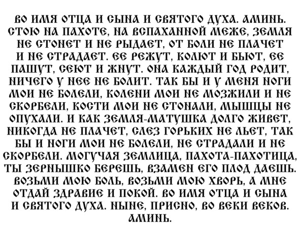 Этот особый заговор непременно поможет тем, кто страдает от болей и отечности в коленях. Отправляйтесь на только что вспаханное поле, встаньте на колени прямо на землю и трижды перекреститесь. Теперь произнесите слова заклинания, и ваши колени мгновенно обретут здоровье и силу: