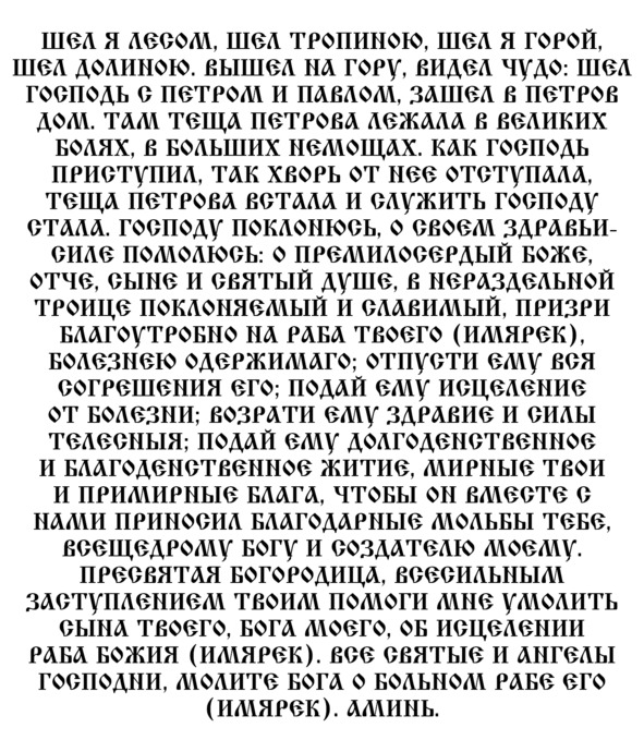Данный целебный заговор обладает невероятной силой и способен мгновенно облегчить страдания. Нередко пациенты отмечают, что уже к концу произнесения этих сакральных слов их самые мучительные боли в желудке полностью исчезают. Однако использовать этот уникальный метод лечения можно только в особый день – в субботу. Для проведения процедуры больного человека следует усадить лицом к иконе, спиной к дверям. Встав за его правым плечом, необходимо трижды произнести заветные строки заговора: