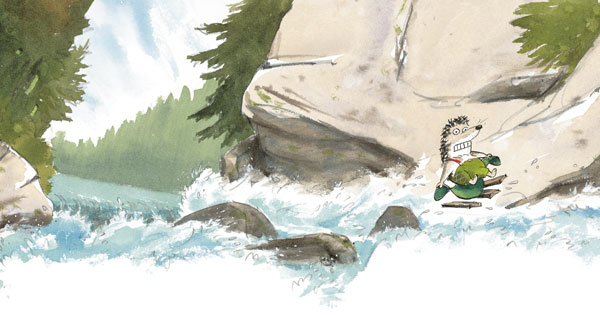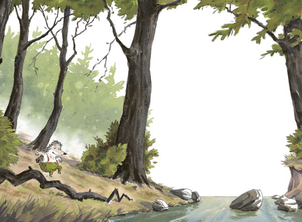 Когда ёж проснулся, уже почти рассвело. Всходило солнце, и небо сияло голубым. Но ручей… Он испуганно огляделся. Что же случилось? Маленький ручеёк, что, извиваясь, бежал через лес, было не узнать. Вокруг него простиралась бескрайняя блестящая водная поверхность. Ручеёк превратился в широкую реку! Пока Латте спал, он оставил лес далеко позади и теперь нёсся мимо огромной равнины, за которой располагалось море. По телу побежали мурашки. До чего удивительный пейзаж! Латте скользил над потрясающей воображение водной гладью. И слева и справа тянулись ужасавшие его пашни и нивы. Вдалеке Латте разглядел человеческие дома и населённые пункты с дорогами, базарными площадями и магазинами. Из высокой трубы шёл чёрный дым, а где-то звонил колокол. Дин-дон.