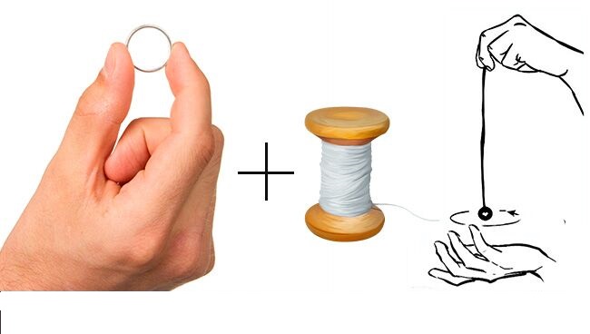 Возьмите любой кулончик, кольцо или грузик и подвесьте его на нитку / цепочку.