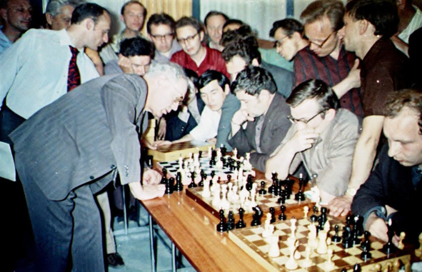 Сеанс одновременной игры между многократным чемпионом мира Ботвинником М. М. и черноголовцами (фото из архива А. Жаркова)
