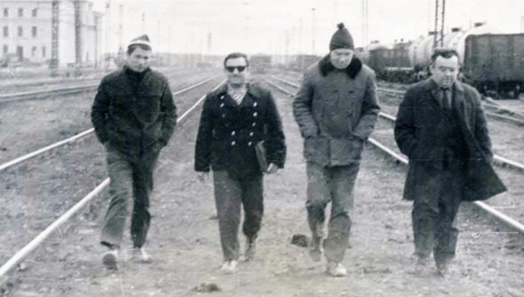 После беседы с Новгородовым М. Д. квартильеры – Тумашов Ю., Бостанджиян В., Ефимов О. отправляются в кабинет его заместителя Пилипенко В. (справа). Слева позади главное здание Управления ж. д. Норильска