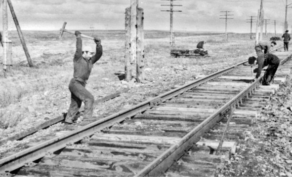 В. Бостанджиян вгоняет костыль в шпалу с двух ударов