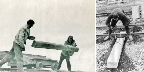 Слева: Слава Грачёв и Лев Буравов. Последняя шпала в воздухе. Пора освобождать колею. Справа: ложе для шпалы уже приготовлено. Пора поместить шпалу на своё место
