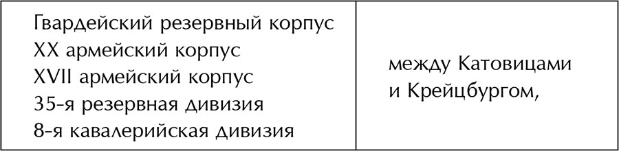 Рано утром 16 сентября я прибыл в Бреславль. Вскоре мне передали телеграмму, в которой верховное командование соглашалось с моим предложением, сделанным вечером 14 сентября. Генерал фон Гинденбург с главными силами 8-й армии должен был следовать в Верхнюю Силезию для непосредственной поддержки австро-венгерской армии. Эти силы образовывали 9-ю армию.