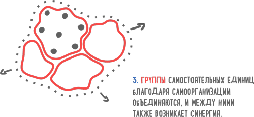 Но на этом все не заканчивается. Самоорганизация происходит не только на уровне взаимодействия единиц, но и при взаимодействии групп. Рано или поздно произойдет слияние и группы также объединятся в сообщество, позволяющее им лучше функционировать. И так далее, шаг за шагом. Самоорганизация происходит на всех уровнях от микромира до макромира. Атомы образуют молекулы, молекулы – клетки, клетки – организмы, организмы создают сообщества.