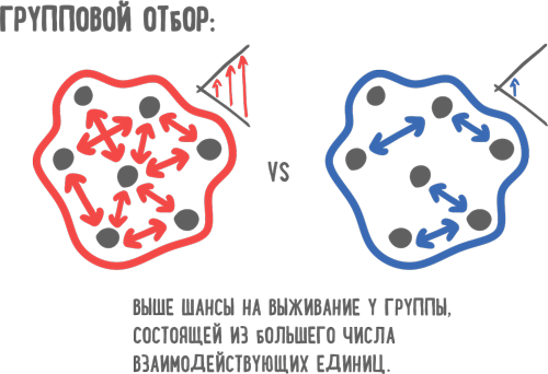 Теория эволюции Дарвина говорит, что выжить могут сильнейшие, они размножатся и их качественные характеристики через потомков разовьются дальше. Неконкурентоспособные особи вымрут, и их генетическая информация потеряется. Дарвин описал и так называемый групповой отбор [37, 117]. Так же как индивидуумы, между собой конкурируют и сообщества.