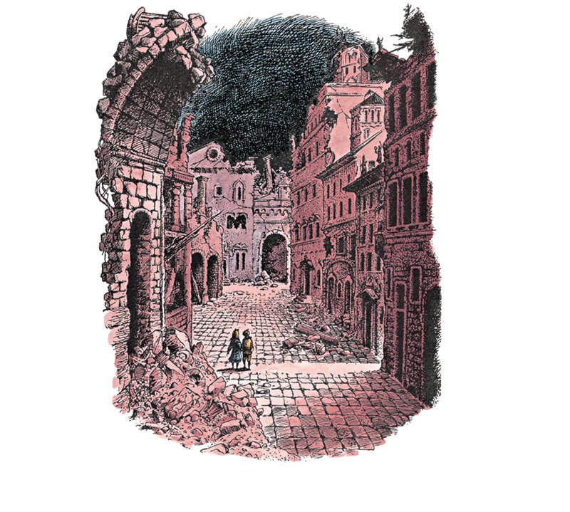 Стены вокруг них были высокие, а в стенах зияло множество незастеклённых окон, чёрных, словно дыры. Пониже, будто входы в туннель, чернели арки. Было довольно холодно. Камень арок и стен был красновато-бурый – может, из-за странного света – и очень, очень старый; плоский камень мостовой был испещрён трещинами. В одной из арок чуть не до половины громоздился мусор. Дети медленно оглядывались, страшась увидеть кого-нибудь в проёме окна.