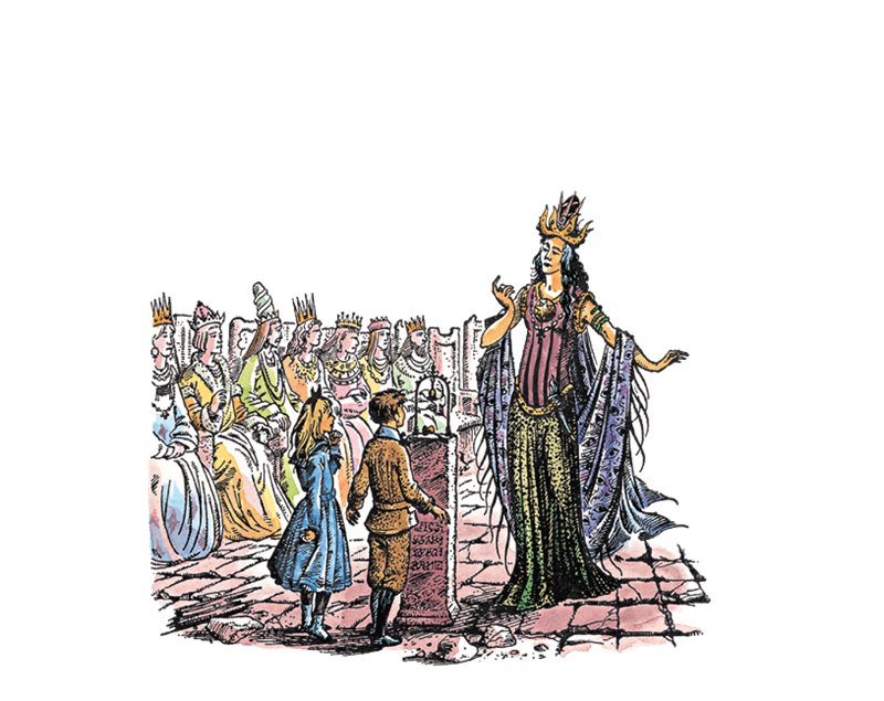Дети смотрели друг на друга поверх невысокой колонны, а колокол ещё подрагивал, хотя и не звонил. Вдруг в дальнем углу что-то зашумело. Они быстро обернулись и увидели, что одна из фигур, самая последняя, поднимается с места (как вы поняли, именно та, что Дигори счёл красивой). Когда она встала, дети увидели, что она невиданно высока. Не только одежды и корона, но и сверкание глаз, изгиб губ говорили о том, что это великая властительница. Медленно оглядев зал, она увидела обломки, заметила детей, но удивления не выказала, а быстро, большими шагами подошла к пришельцам и спросила: