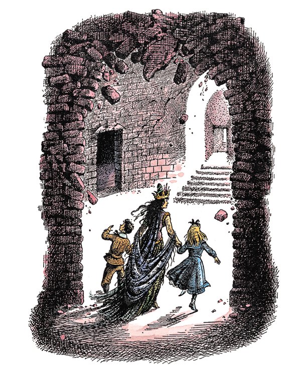 – Тут оставаться нельзя, – совершенно спокойно сказала королева. – Дворец скоро рухнет. Идёмте. – И протянула одну руку Дигори, другую – Полли.