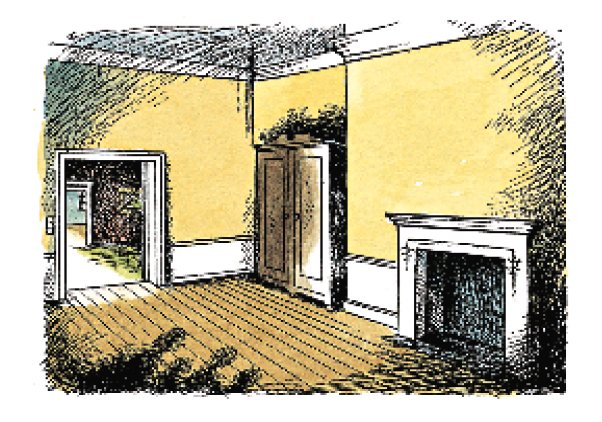Дом, в который они попали, казалось, не имел конца и был полон самых удивительных мест. Несколько дверей, которые они открыли первыми, как и ожидалось, вели в пустые спальни. Но вскоре они попали в очень длинную комнату, полную картин. Там же ребята обнаружили рыцарские доспехи. За ней следовала комната, задрапированная зелёной тканью, со стоящей в углу арфой. Затем шли три ступени вниз, и пять – наверх, в небольшую галерею с дверью на балкон. Дальше шла анфилада комнат, переходящих одна в другую и уставленных рядами книг, преимущественно очень старых, некоторые из которых были даже больше церковной Библии в церкви. Вскоре они добрались до комнаты, в которой стоял один платяной шкаф – такой, в дверце которого обычно располагалось зеркало. В комнате больше не было ничего, лишь на подоконнике валялась дохлая муха.