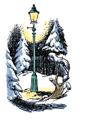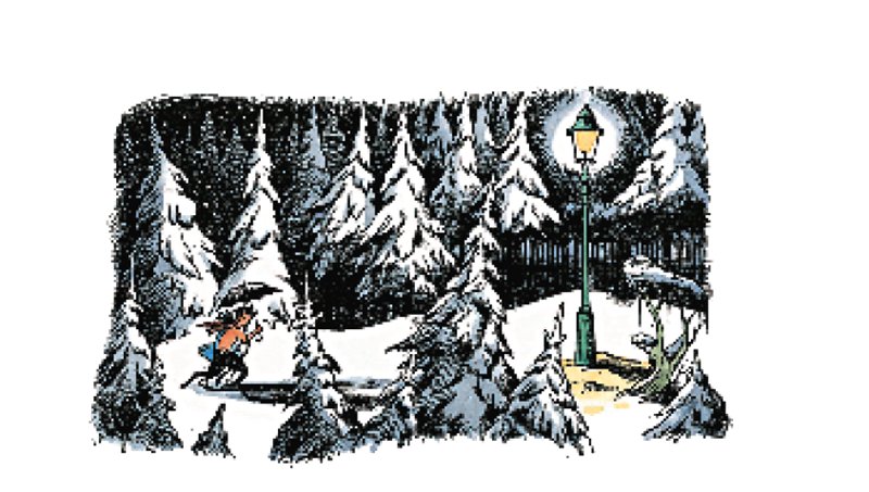 – Я всегда смогу вернуться, если что-то будет не так, – успокоила себя Люси и отправилась по лесу к далёкому свету. Снег под ногами поскрипывал – скрип-скрип. Минут через десять она дошла до него и обнаружила, что это горит фонарь. Она стояла и смотрела на фонарь, размышляя, кому он понадобился посреди леса и что ей дальше делать, как вдруг услышала приближающийся лёгкий топот. Вслед за этим под свет фонаря из-за деревьев вышло очень странное существо.