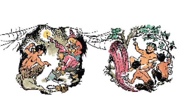 Очень скоро земля под ногами у них стала неровной, повсюду вокруг громоздились скалы, небольшие холмы то возвышались над ними, то виднелись внизу. В глубине маленького ущелья мистер Тумнус внезапно повернул в сторону, словно решил пройти сквозь огромную скалу, но в последний момент Люси поняла, что он ведёт её в пещеру. Оказавшись внутри, девочка зажмурилась от света горевшего очага. Мистер Тумнус нагнулся, маленькими щипцами выхватил оттуда горящее полено и зажёг от него лампу.