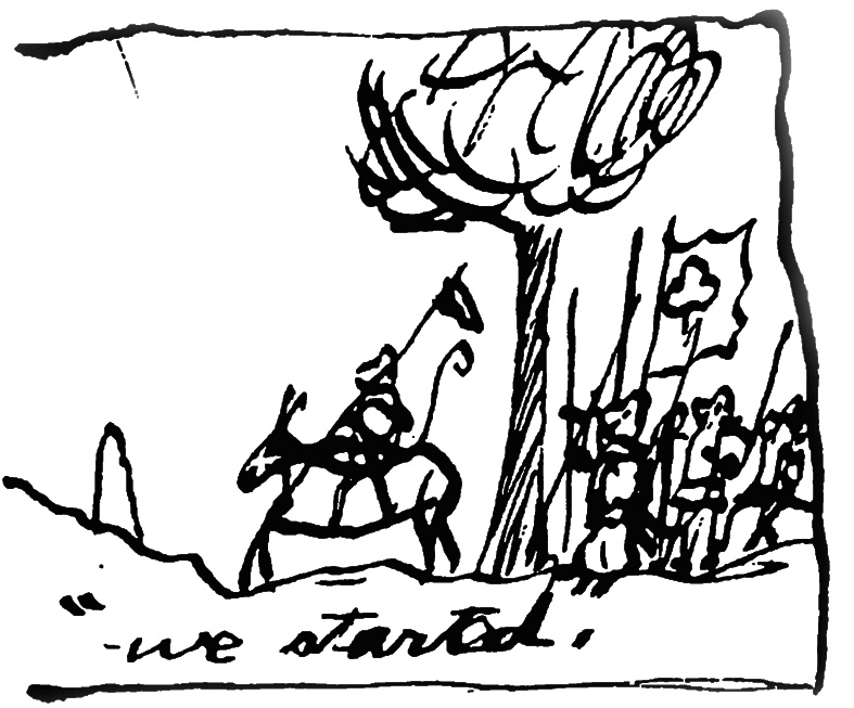 In the early morning we covered our shining armour with dark cloaks and crept up behind the cat-sentrys back each and killed him. Then we rushed in and set fire to the hostile tents. The confusion was dreadfull. Everywhere the boom and sullen thunder of guns, the groans of the wounded the crackle of the fires and the wild shouts of ‘Sir Peter for ever’ then on ‘In the name of the king!’ When all of a suden the long fierce strain was over. The cats had fled. There camp was smoking ruins. Murry gates were open. The seige was raised!