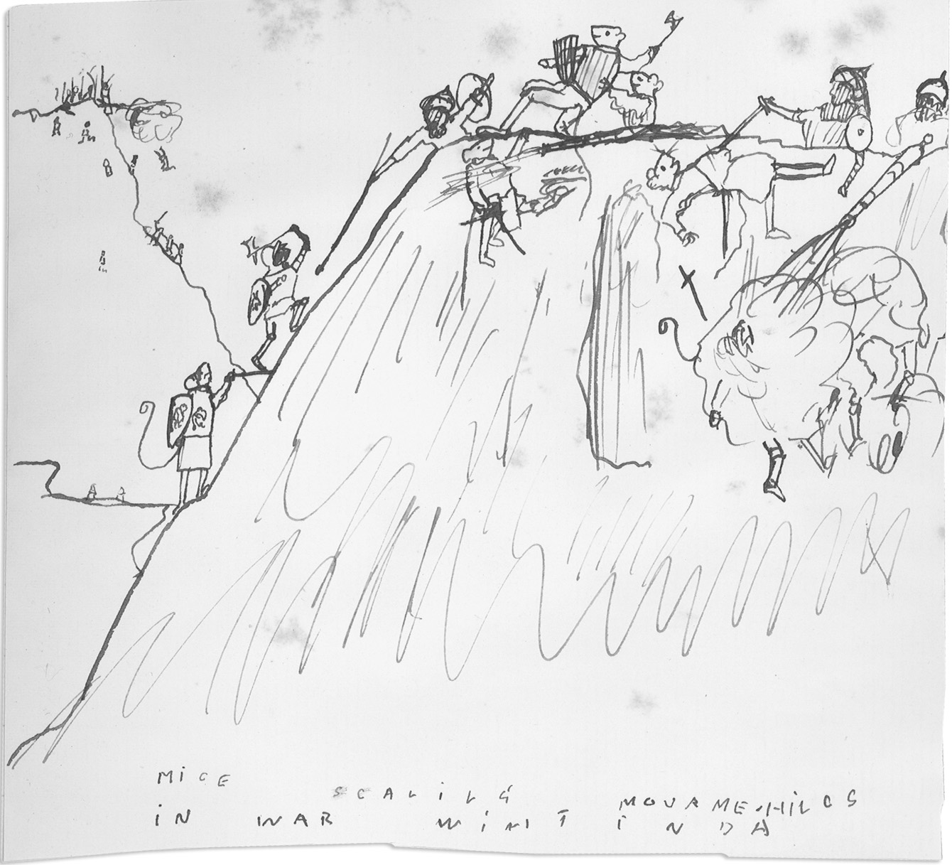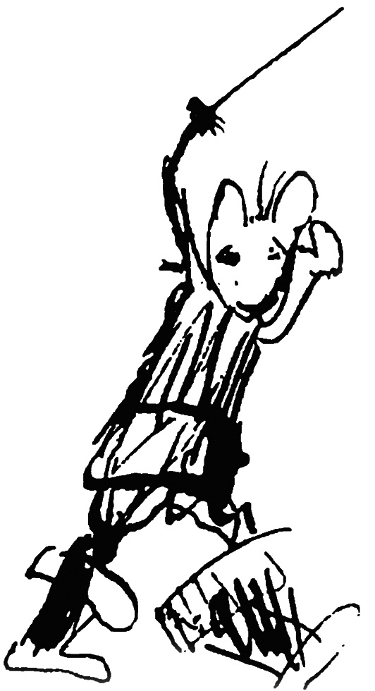 He [Sir Peter Mouse] probably meant to go on to Englington, and, taking with him the soldiers quartered there, march to Cat-land and reduce the natives to submission. However, while his soldiers were encamped for the night, the Cats stole up with an enormous army-posted themselves on a hill, high above the mice; threw up a rampart of earth, placing there infantry (mostly bowmen) behind it, and their cavalry in front of it, ready to charge down the slope of the hill onto the mice (see map). While Sir Peter’s army was still asleep, the cavalry charged down upon the camp, and did untold damage; then, before the mice could recover from their surprise or properlly arm themselves, the cavalry cleared away, and the bowmen shot their arrows into the camp. Then the whole Cat force swept down and the Mice were utterly routed. Sir Peter Mouse was slain and very few mice escaped. The Cats hotly pursued the few fugitives to Murry, and then beseiged the capital itself! The Cats sent home for more soldiers and more supplys. After almost a year and a ½, (during which time the citizens suffered terrible privations), the seige was raised by 2 mice who had risen from the ranks; one of them was Thomas Jasper (son of Sir Jasper, who had rescued King Benjamin), and the other his friend Robert. How they did it is not certain, because so many stories about them are fables: but it is likely they did it by cunning: after this the Cats retired to their own state.