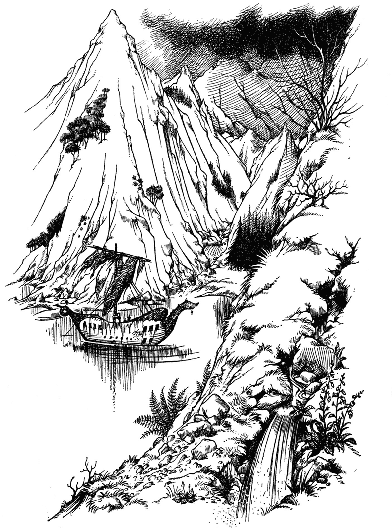 Наступило утро. Серое небо буквально нависало над головой, стояла духота. Путешественники поняли, что находятся в заливе, окружённом скалами и утёсами, похожем на норвежский фьорд. Впереди, за заливом, виднелась равнина, густо заросшая деревьями, напоминавшими кедры, между которыми журчала речушка. Позади поднималась зубчатая горная гряда, а ещё дальше темнели сами горы, сливавшиеся с хмурыми облаками, так что вершин их было не разглядеть. Ближайшие утёсы по обе стороны залива казались прочерченными белыми полосками, в которых все узнали водопады, хотя с такого расстояния движения воды не было заметно и звука не слышно. Стояла тишина, и вода в заливе была гладкой, как стекло, так что утёсы в ней отражались до мельчайших подробностей. Наверное, на картине этот вид выглядел бы красиво, но в жизни, пожалуй, действовал угнетающе. Этот край вообще трудно было назвать гостеприимным.