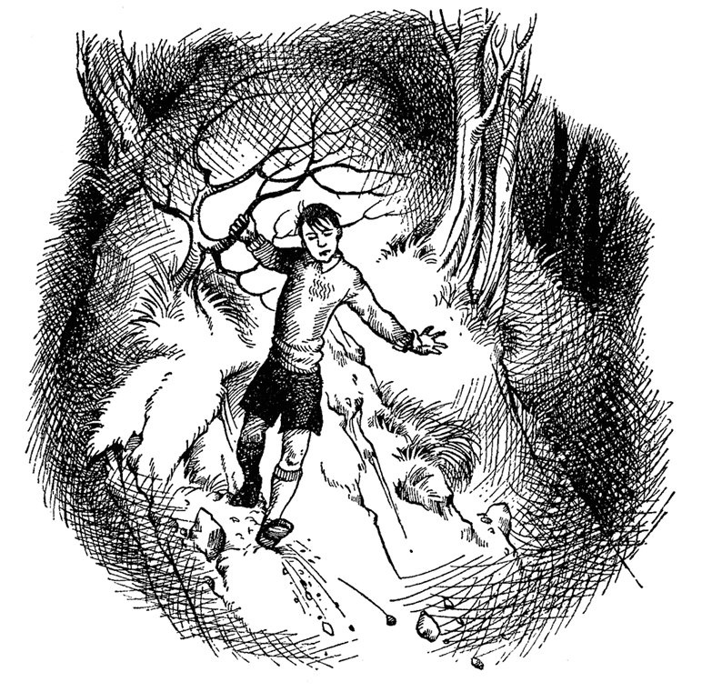 Юстас почувствовал, что может перейти на более быстрый и решительный шаг, и вскоре вышел на опушку, оказавшись перед крутым склоном. Подниматься по сухой траве было трудно, но, действуя руками и ногами, пыхтя и то и дело ударяясь лбом о землю, он продолжал путь. Кстати, это свидетельствует о том, что новая, непривычная для него жизнь пошла ему на пользу: прежний Юстас, который во всём полагался на родителей, сдался бы через десять минут.