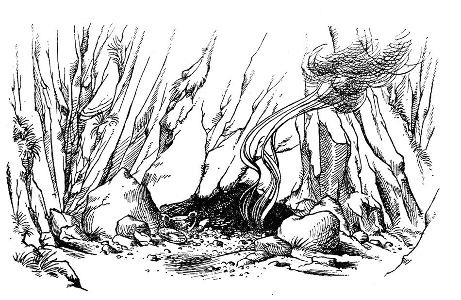 У подножия утёса, чуть левее того места, где стоял Юстас, виднелась тёмная нора – похоже, вход в пещеру, – и оттуда поднимались две тонкие струйки дыма. То, что он принял за камни, валявшиеся перед норой, вдруг пошевелилось (этот звук он и услышал), как будто кто-то прополз в темноте.
