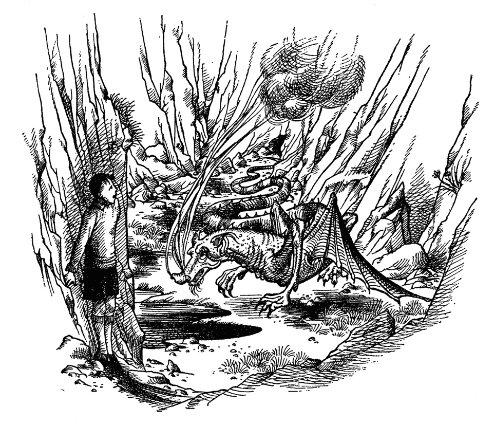 Юстас долго не осмеливался шевельнуться. А вдруг эта тварь только прикидывается? Может, таким образом она подманивает путников, чтобы погубить. Но ждать вечно невозможно, поэтому он сделал шаг вперёд, затем ещё два и снова замер. Дракон по-прежнему не двигался. Юстас заметил, что красный огонёк в его глазах погас, и решился наконец подойти. Теперь было совершенно ясно: дракон мёртв. Брезгливо содрогнувшись, мальчик дотронулся до него, но ничего не произошло.