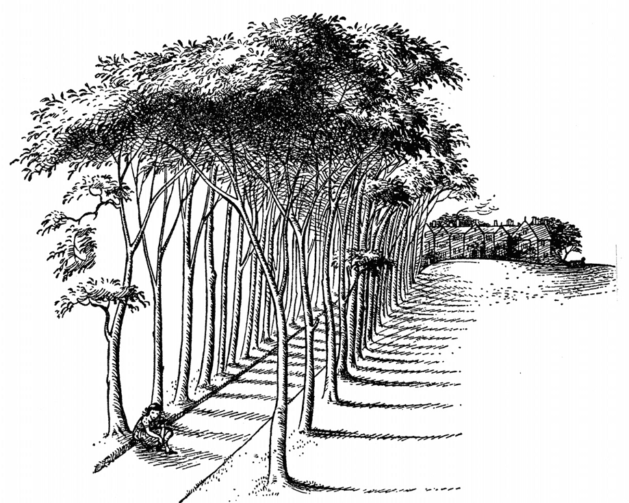 Они вышли на длинную прямую песчаную дорожку без единой травинки, по обе стороны которой ровными рядами стояли деревья, и вдали, на другом конце, увидели в лучах полуденного солнца дом – очень длинный и безмолвный.