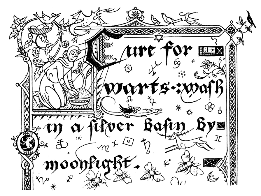 Здесь не было ни титульной страницы, ни названия: заклинания начинались сразу и поначалу не содержали ничего важного: средства от бородавок (вымыть руки лунным светом в серебряном тазу); средство от зубной боли и колик, затем заклятие, с помощью которого можно снять пчелиный рой. Мужчина с больным зубом был изображён настолько живо, что при взгляде на него начинало казаться, что и у тебя болит зуб, а золотые пчёлы, нарисованные рядом с соответствующим заклинанием, казались живыми.