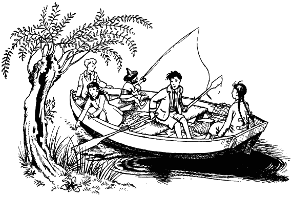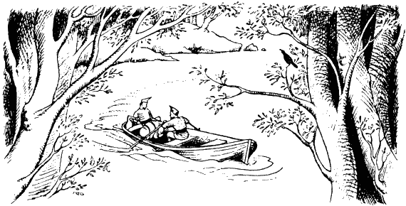 Четверо детей и гном подошли к краю воды, не без труда оттолкнули лодку и вскарабкались в неё. Гном сразу же взял на себя управление. Весла, конечно, были слишком для него велики, так что греб Питер, а гном направлял их на север вдоль пролива и дальше на восток вдоль оконечности острова. Теперь ребята видели реку, все заливы и выступы берега вдали. Некоторые казались знакомыми, но леса, которые разрослись за это время, очень все изменили.