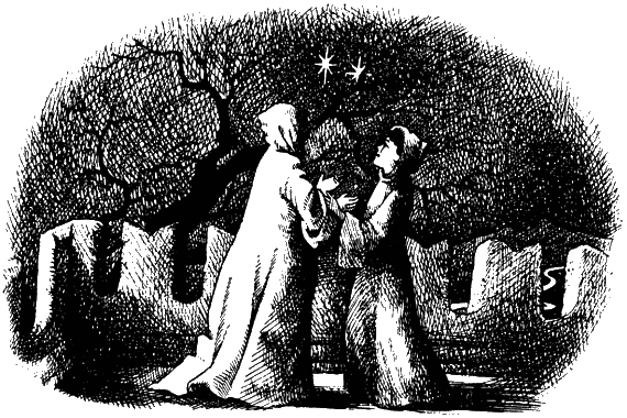 Лестница была длинная и крутая, но, когда они вышли на крышу и Каспиан отдышался, он понял, что потрудиться стоило. Справа он, хоть и смутно, различал Западные горы, слева светилась Великая река, и так тихо было кругом, что доносился шум водопадов у Бобровой Плотины, в миле отсюда. Нетрудно было отличить две звезды, ради которых они сюда поднялись. Они висели низко на южной стороне неба, яркие, как две луны, и очень близко друг к другу.
