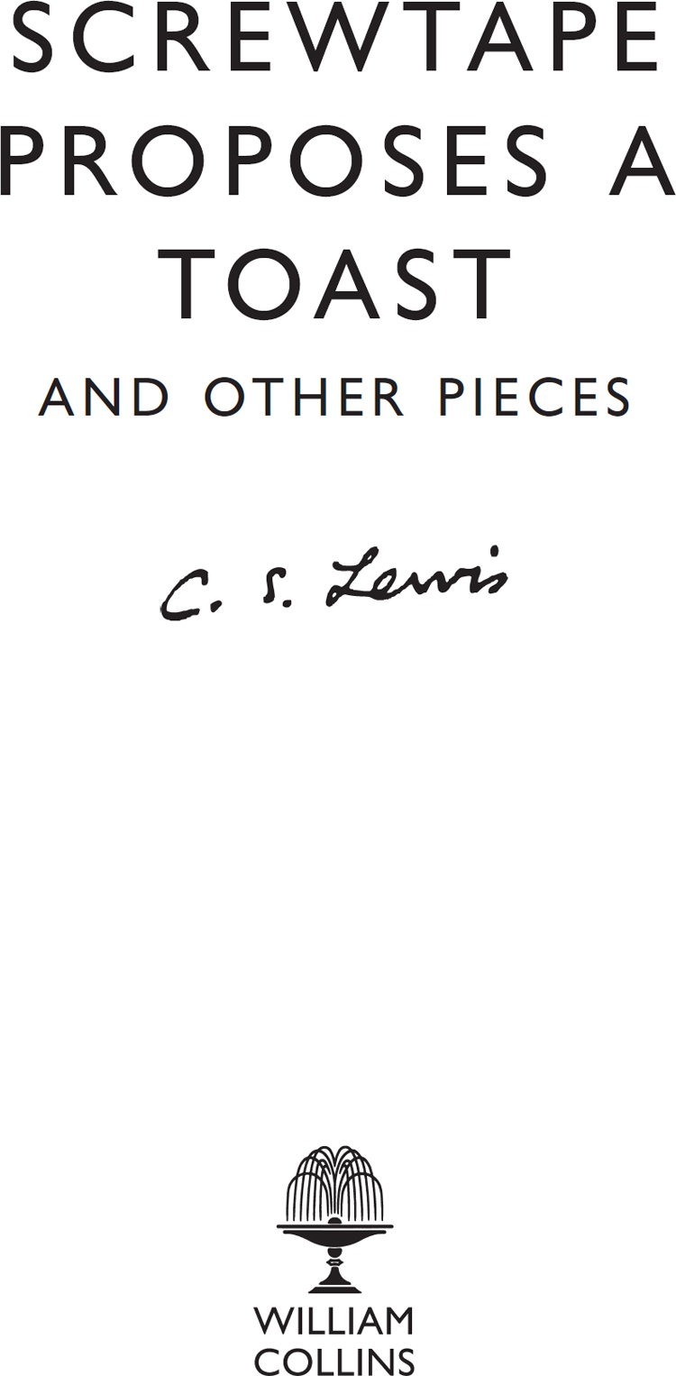 C. S. Lewis had finished putting this book together shortly before his death on 22nd November 1963. It is devoted almost entirely to religion and the pieces are derived from various sources. Some of them have appeared in They Asked for a Paper (Geoffrey Bles, London 1962, 21s.), a collection whose subjects included literature, ethics and theology. ‘Screwtape Proposes a Toast’ was initially published in Great Britain as part of a hard-covered book called The Screwtape Letters and Screwtape Proposes a Toast (Geoffrey Bles, London 1961, 12s. 6d.). This consisted of the original ‘The Screwtape Letters’, together with the ‘Toast’, and also a new preface by Lewis. Meantime, ‘Screwtape Proposes a Toast’ had already appeared in the United States, first as an article in The Saturday Evening Post and then during 1960 in a hard-covered collection, The World’s Last Night (Harcourt Brace and World, New York).