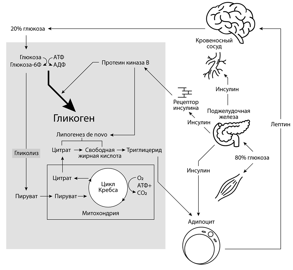 Рисунок 2–1: a) Путь метаболизма глюкозы в печени. Более подробную информацию можно найти в главе 7, в разделе «Клеточная биология 101». Только 20 % глюкозы поступает в печень, а большая часть превращается в гликоген (крахмал в печени) для хранения. Небольшое количество глюкозы подвергается гликолизу (первый этап метаболизма глюкозы, не требующий кислорода) до продукта распада – пирувата. Затем пируват попадает в митохондрии и сжигается в цикле Кребса до углекислого газа и воды, получая энергию в виде химического вещества аденозинтрифосфата (АТФ) – энергия запасается в виде фосфатов.