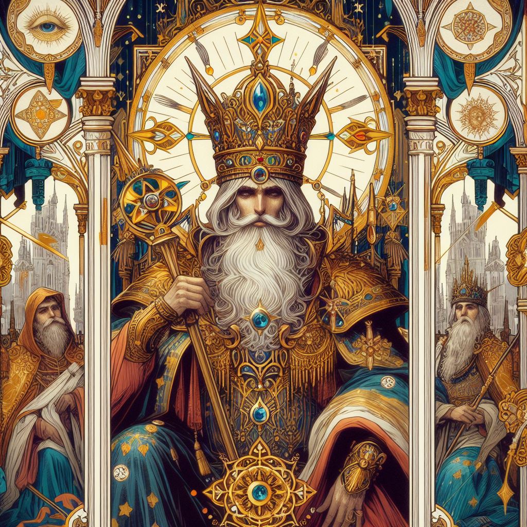 Карта Таро «Император» изображает мужественную фигуру, сидящую на троне, часто в окружении символов власти и авторитета, таких как трезубец или корона. Он обычно изображается во всей своей силе и уверенности, смотря прямо перед собой или вдаль, выражая решимость и власть.