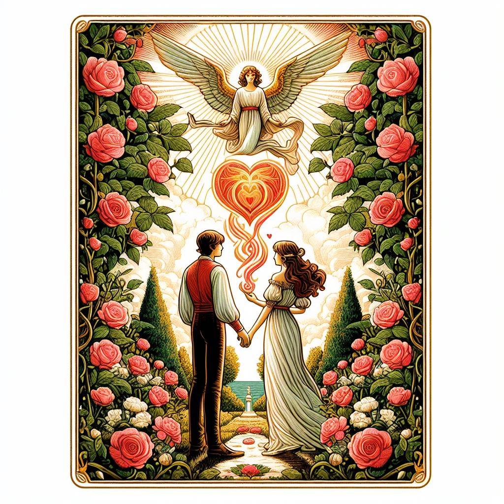 Карта Таро «Любовники» изображает мужчину и женщину, стоящих рядом друг с другом, часто под защитой ангела или облаченных в одежду, символизирующую их гармонию. Они обычно представлены перед выбором между двумя путями или двумя различными аспектами жизни. Возле них часто изображен Купидон или сердце, символизирующие любовь и страсть.