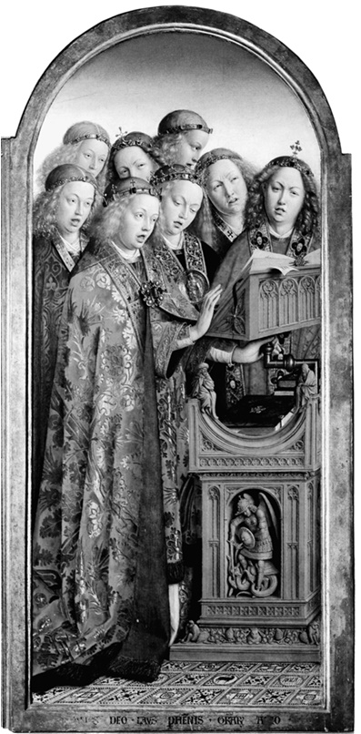 Рис. 1. Ян ван Эйк. Поющие ангелы. Левая створка алтаря в соборе Святого Бавона в Генте. Масло, дерево, 161,7 × 69,3 см, 1432. – На Гентском алтаре представлены, среди прочих фигур, восемь поющих ангелов перед нотным пюпитром, внизу которого изображен святой Георгий. Возможно, ангелы исполняют многоголосное (четырехголосное?) произведение. Так или иначе бросается в глаза разнообразие поз и выражений лиц. Это указывает на то, что музыка интересовала художника в ее реальном звучании.
